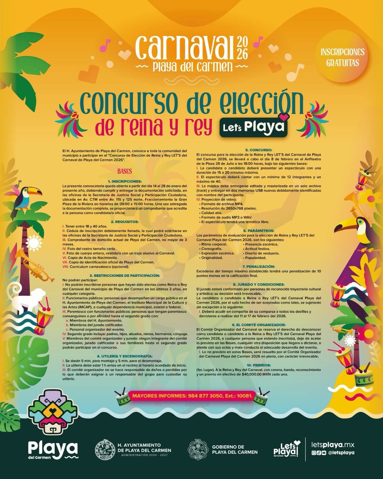 PDC NewsPDC NewsPDC News Carnaval de Playa del Carmen 2026 El Carnaval de Playa del Carmen 2026 se celebrará del 23 de febrero al 4 de marzo, convirtiendo a este destino del Caribe Mexicano en el epicentro de la fiesta, la música y la tradición. Durante más de una semana, la ciudad ofrecerá desfiles, conciertos gratuitos, comparsas y actividades culturales para locales y turistas. Fechas del Carnaval de Playa del Carmen 2026Del 11 al 17 de febrero – Derroteros, paseos de comparsas y eventos previos en distintos puntos de la ciudad.23 de febrero – Inicio oficial y elección de la Reina y el Rey del Carnaval. Del 27 de febrero al 3 de marzo – Presentaciones estelares de artistas invitados.4 de marzo – Gran cierre con desfile final y actividades tradicionales. Artistas invitados al Carnaval de Playa del Carmen 2026El Carnaval contará con un cartel artístico de primer nivel, con conciertos gratuitos al aire libre. Estos son los Artistas hasta ahora confirmados, según la Presidenta Municipal:14 de Febrero – BELLAKATH15 de febrero – Santa Fe Klan16 de Febrero – NSQK17 de febrero – 90’s Pop Tour (OV7, Kabah, JNS, Magneto, Mercurio y más) Actividades del CarnavalDurante el Carnaval Playa del Carmen 2026 se podrán disfrutar:Desfiles de carros alegóricos y comparsasConcursos de disfraces y batucadasCoronación de los reyes del carnavalEventos culturales y familiaresConciertos masivos gratuitos en plazas públicasEste evento combina tradición, música y turismo, atrayendo a miles de visitantes nacionales e internacionales. Además de disfrutar del carnaval, los asistentes pueden aprovechar las playas de Playa del Carmen, su gastronomía y la cercanía con otros destinos de la Riviera Maya. El Carnaval de Playa del Carmen 2026 es una de las fiestas más importantes de Quintana Roo y una experiencia imperdible para quienes buscan diversión, cultura y espectáculos en un entorno paradisíaco. (Nota: PDC News) Convocatorias para comparsas y elección de los Reyes del Carnaval Visitante: 21 Navegación de entradas Playa del Carmen en la FITUR 2026 Puerto Cerrado en Cancún